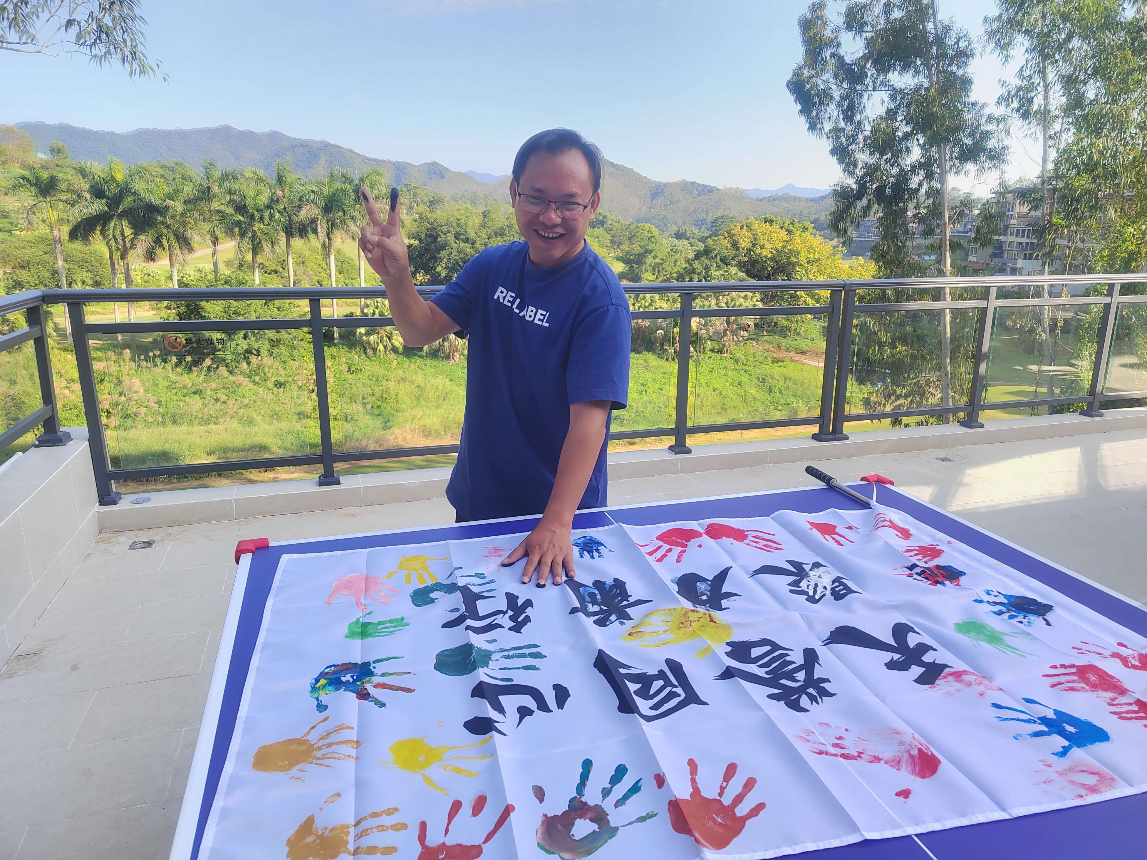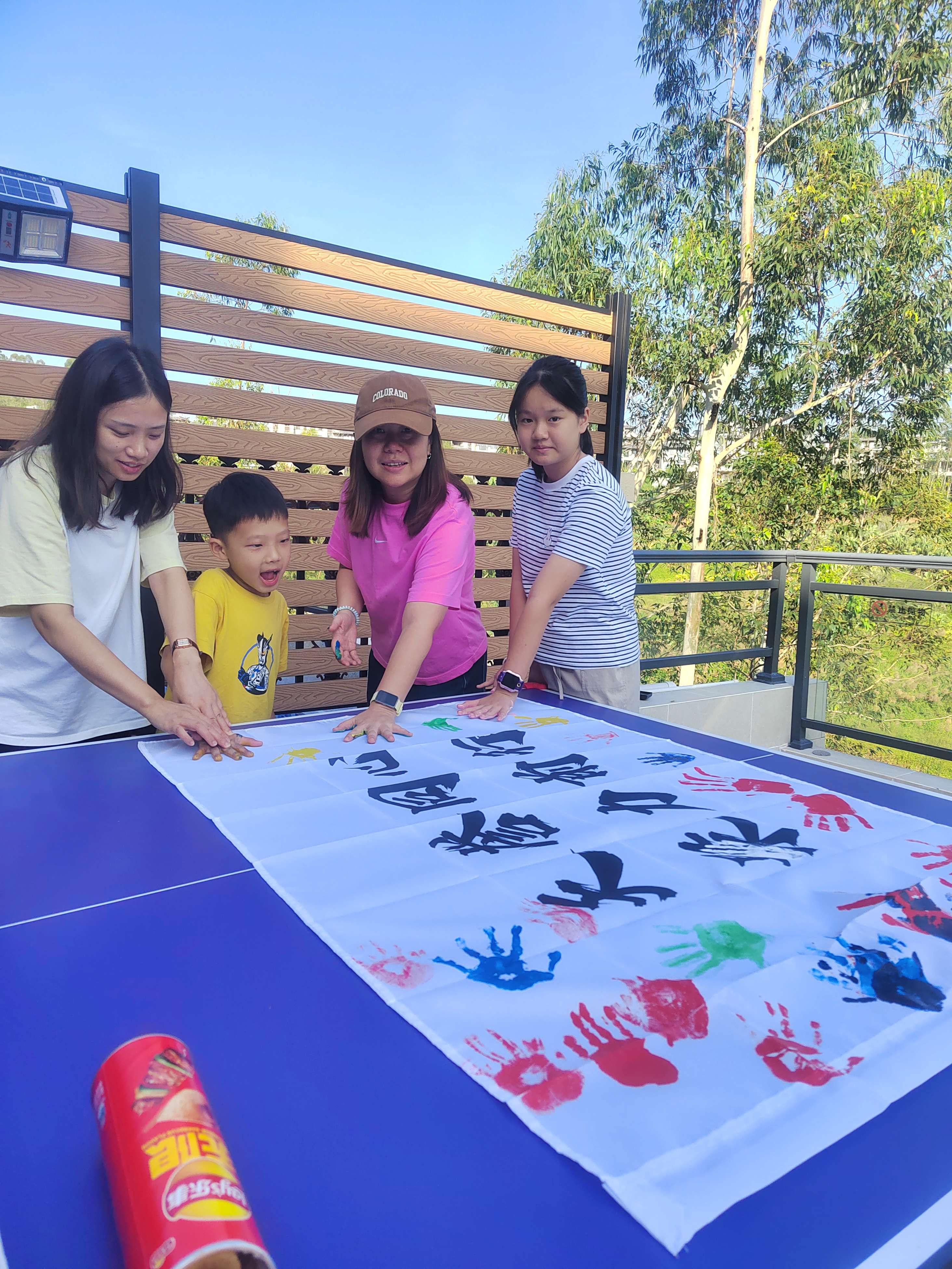 26日午,活動進入溫馨而富有儀式感的環(huán)節(jié)。全體成員在印有“暫別工作崗位,奔赴山??鞓贰钡臋M幅下拍攝了洋溢著燦爛笑容的大合照。隨后,大家在公司精心準備的紀念旗上,鄭重按下五彩手印。旗面上“天譽同心,聚力前行”的標語與每一個獨特的手印交織在一起,象征著天譽環(huán)保團隊力量的匯聚與融合,成為此次團建最珍貴的紀念。